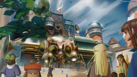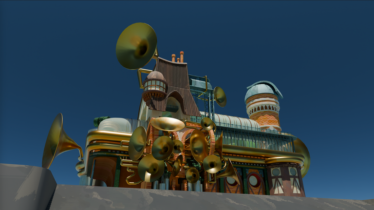 An anachronistically designed building of varying architectural periods, the Brass Aviary serves as a home for the capital cities birds. In exchange, the many trumpets extruding from the building amplify the sounds from within, able to be heard from wherever you are within the city walls.